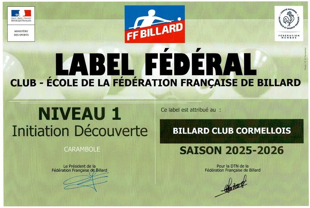 Le Billard Club Cormellois possède un label fédéral qui témoigne de notre engagement envers l’excellence.